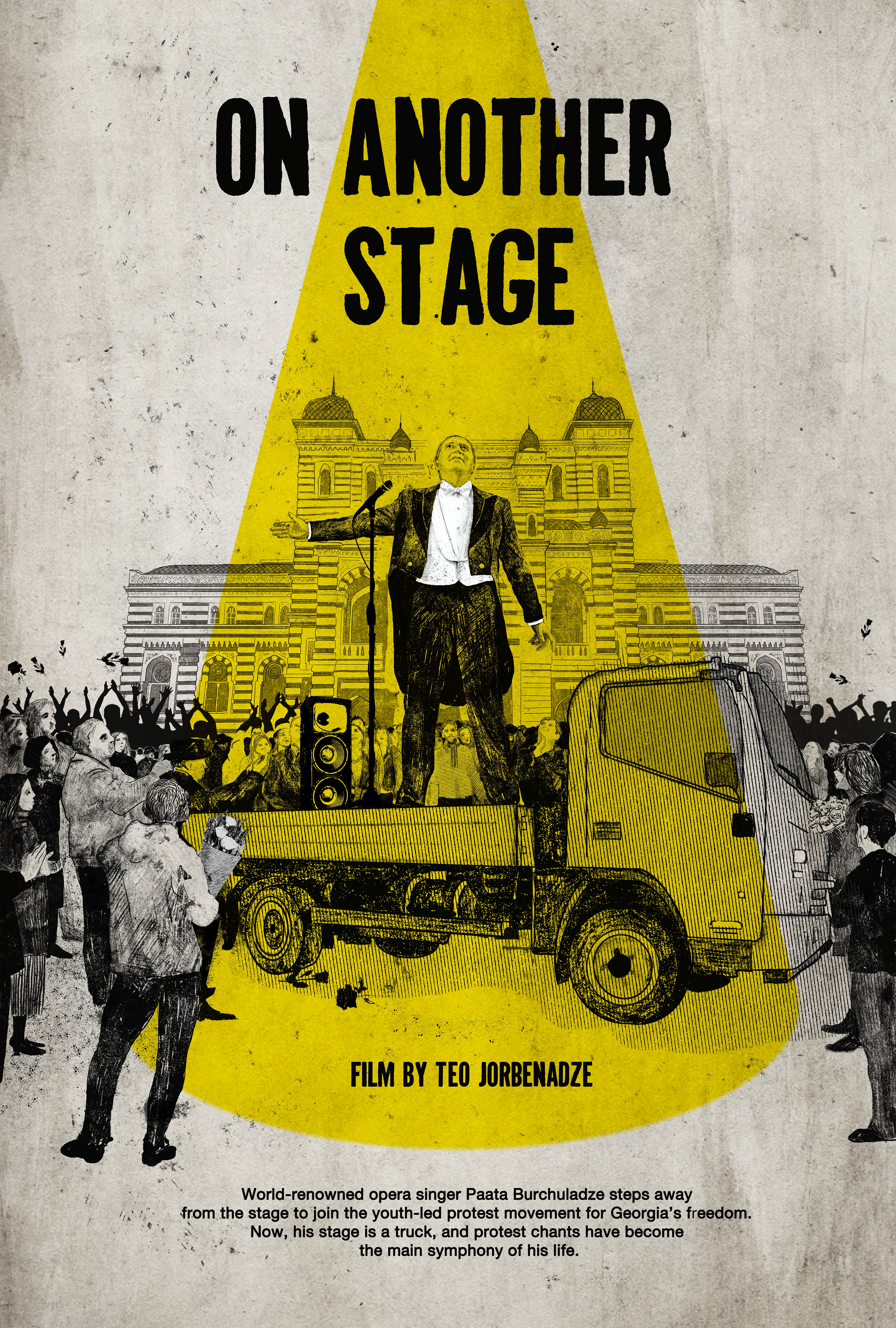 Als Georgien in eine Krisenphase geriet, traf er eine radikale Entscheidung. Im Alter von siebzig Jahren ließ er Sicherheit und Anerkennung hinter sich und stand mehr als dreihundert Tage lang mit dem georgischen Volk auf den Straßen von Tiflis. Am 5. Oktober wurde er verhaftet und muss nun mit einer Freiheitsstrafe von bis zu neun Jahren rechnen. „On Another Stage“ ist keine Biografie. Diese Geschichte lebt in meiner Familie, in meiner Erinnerung und entfaltet sich vor unseren Augen. Natürlich ist es meine Hauptaufgabe, ihm zu helfen, indem ich diese Geschichte erzähle, und ich hoffe, dass sich die Menschen zusammenschließen, um diesen freundlichen und großartigen Mann zu retten. Ich glaube, dass ohne Solidarität weder das Leben noch das Kino einen Sinn haben. - Director's Note, Teona Jorbenadze