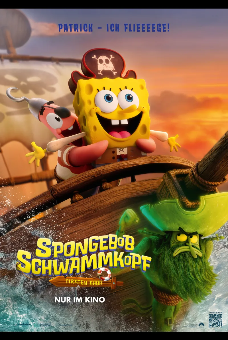 In ihrem brandneuen und bisher größten Kinoabenteuer stechen SpongeBob und seine Freunde aus Bikini Bottom in See! SpongeBob, der endlich auch zu den Großen gehören möchte und Mr. Krabs seinen Mut beweisen will, folgt dem Fliegenden Holländer — einem mysteriösen, verwegenen Geisterpiraten. Und so beginnt ein rasantes und witziges Seefahrts-Abenteuer, das ihn in die tiefsten Tiefen der Tiefsee führt, wo noch kein Schwamm zuvor gewesen ist.